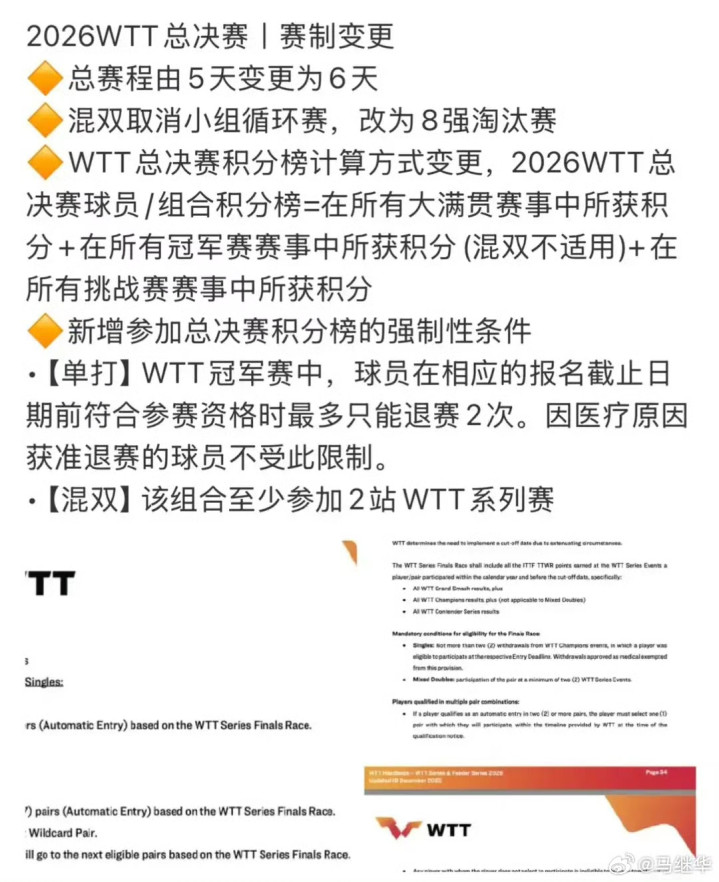 世乒联对2026年的总决赛法规进行更动,第一项是赛程由5天变为6天,第二是混双取消小组轮回赛,改为八强淘汰赛。第三是积分榜的计较神态变更。第四是新增投入总决赛积分榜的强制性要求。关于混双来说,最少要投入2站WTT系列赛事。